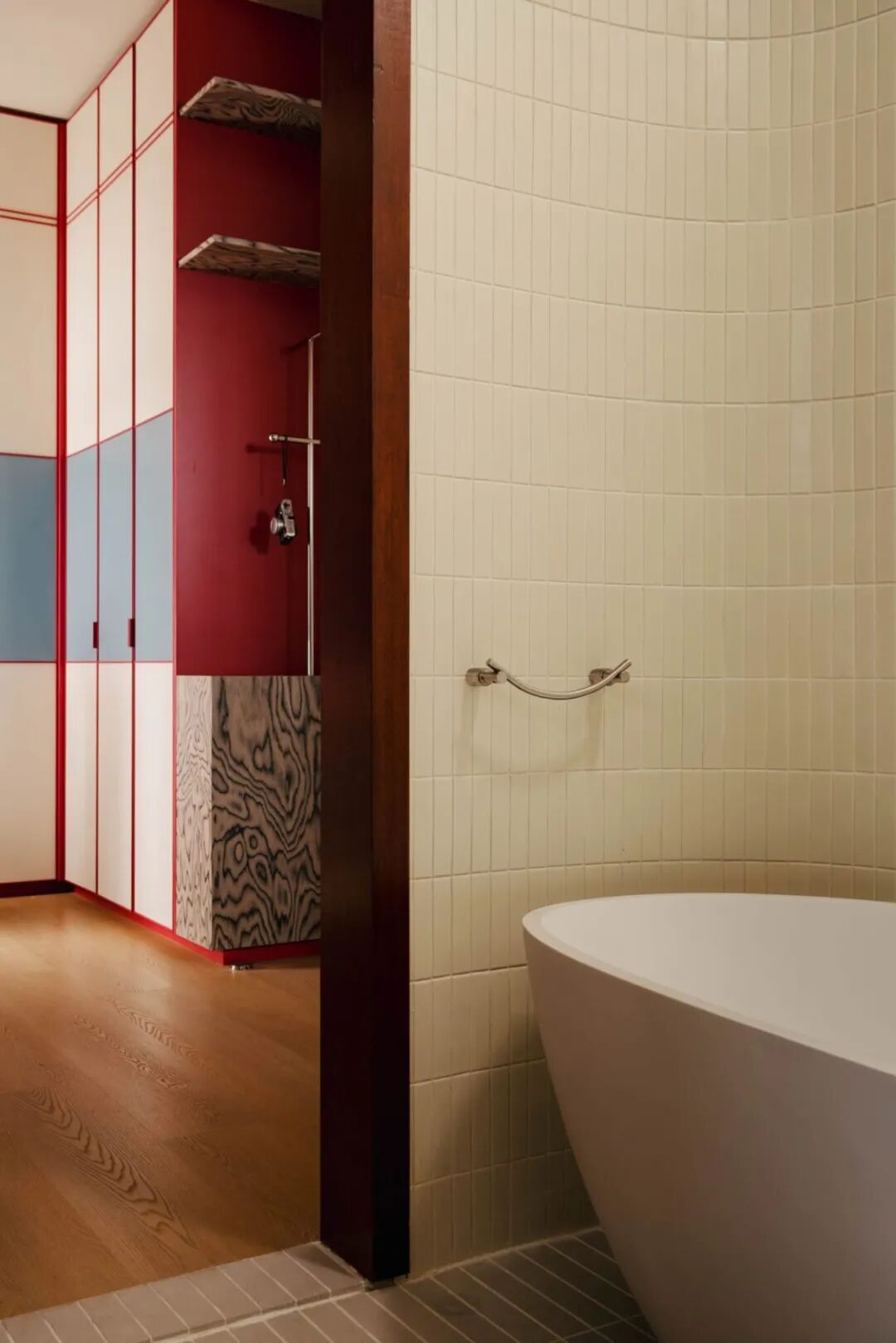 在空间的布局上,设计团队充分考虑到每个区域的功能性,同时保持设计的美学完整性。楼上的卧室被改造成步入式衣橱,扩大了主卧的功能区,并增加了上层的豪华感。而最具创意的设计亮点出现在入口处,门厅用强烈的红色包围,创造出封闭的私密空间,接着又通过宽敞的米色内饰带给人一种舒适的“释放”感,整个空间在进入后呈现出一种平静、开阔的氛围。